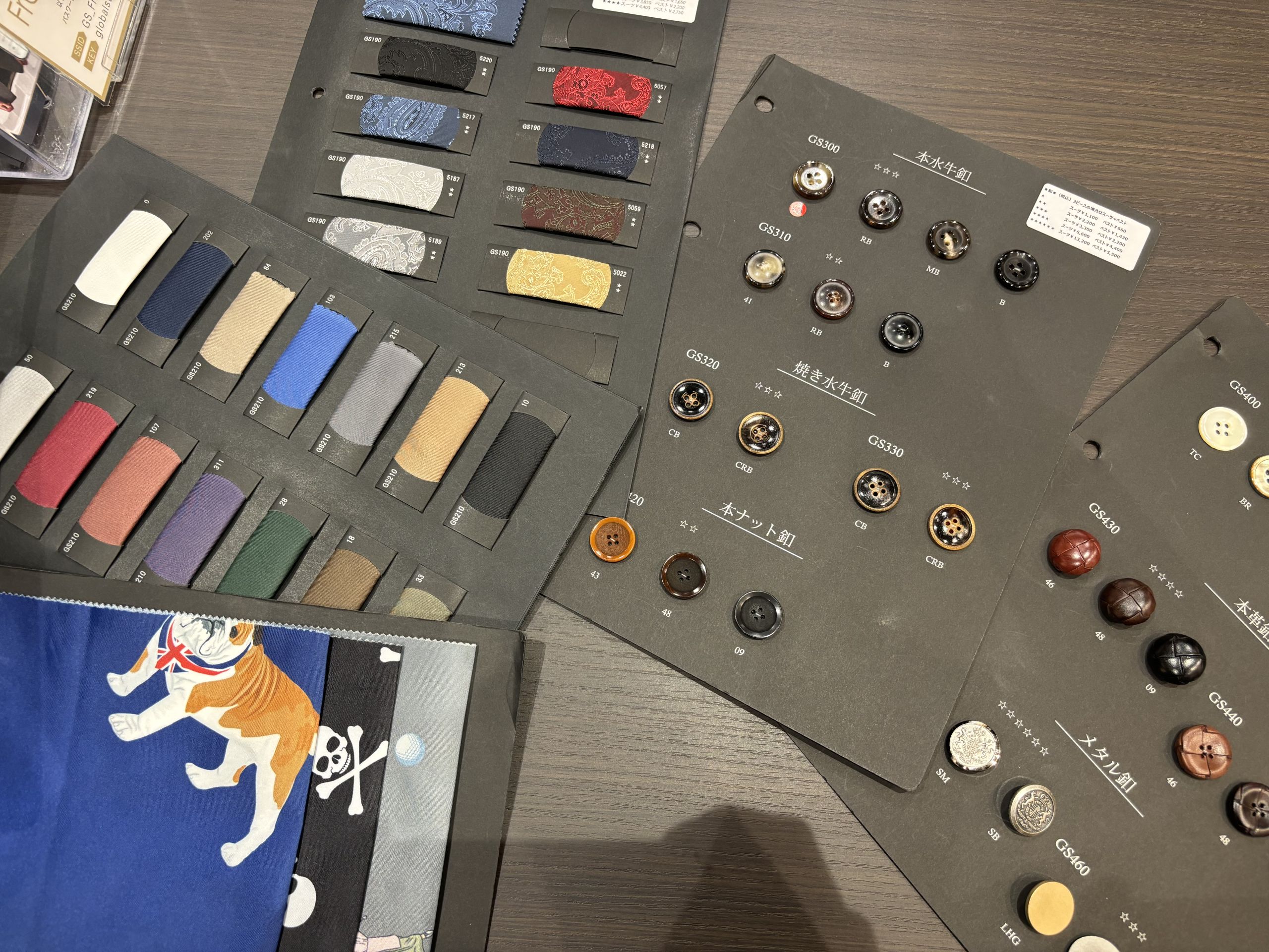 釦、裏地もおよそ200種類の中から組み合わせて選んでいただけます。