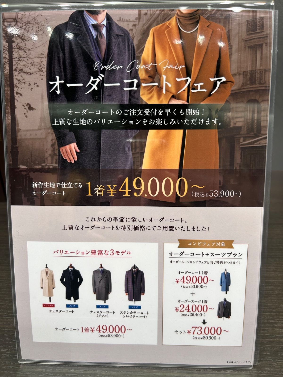 スーツ(税込み¥26,400~)+コート(税込み¥53,900~)で税込み¥80,300~ご注文を承れます!