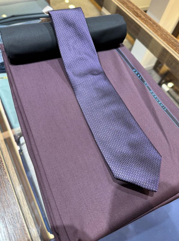そして最近のスーツコーデですね、ワインレッドのスーツに黒シャツ、パープル系の組み合わせでした。