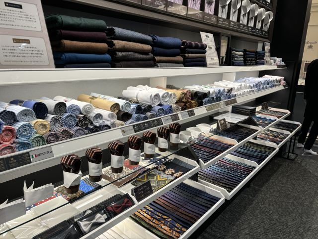 色柄豊富のオーダーシャツから個性豊かなネクタイ、本格的な革靴まで。