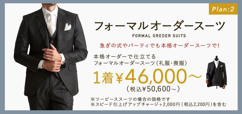 フォーマルオーダースーツの価格は、1着¥46,000(税込¥50,600)~になります!