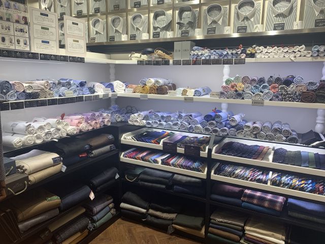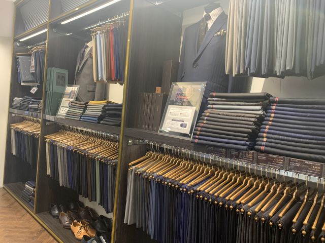 左手に進むとスーツ生地がずらり。