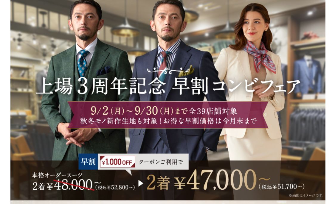 今ご紹介させて頂いてるプランがスーツを二着で作って頂くと二着コンビ価格でご案内ができます