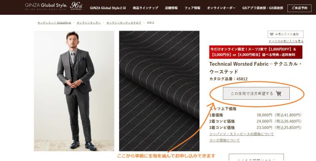 ちょっと見えにくいですが、上の画像の「この生地で注文希望する」をクリック(またはタップ)していただくと、