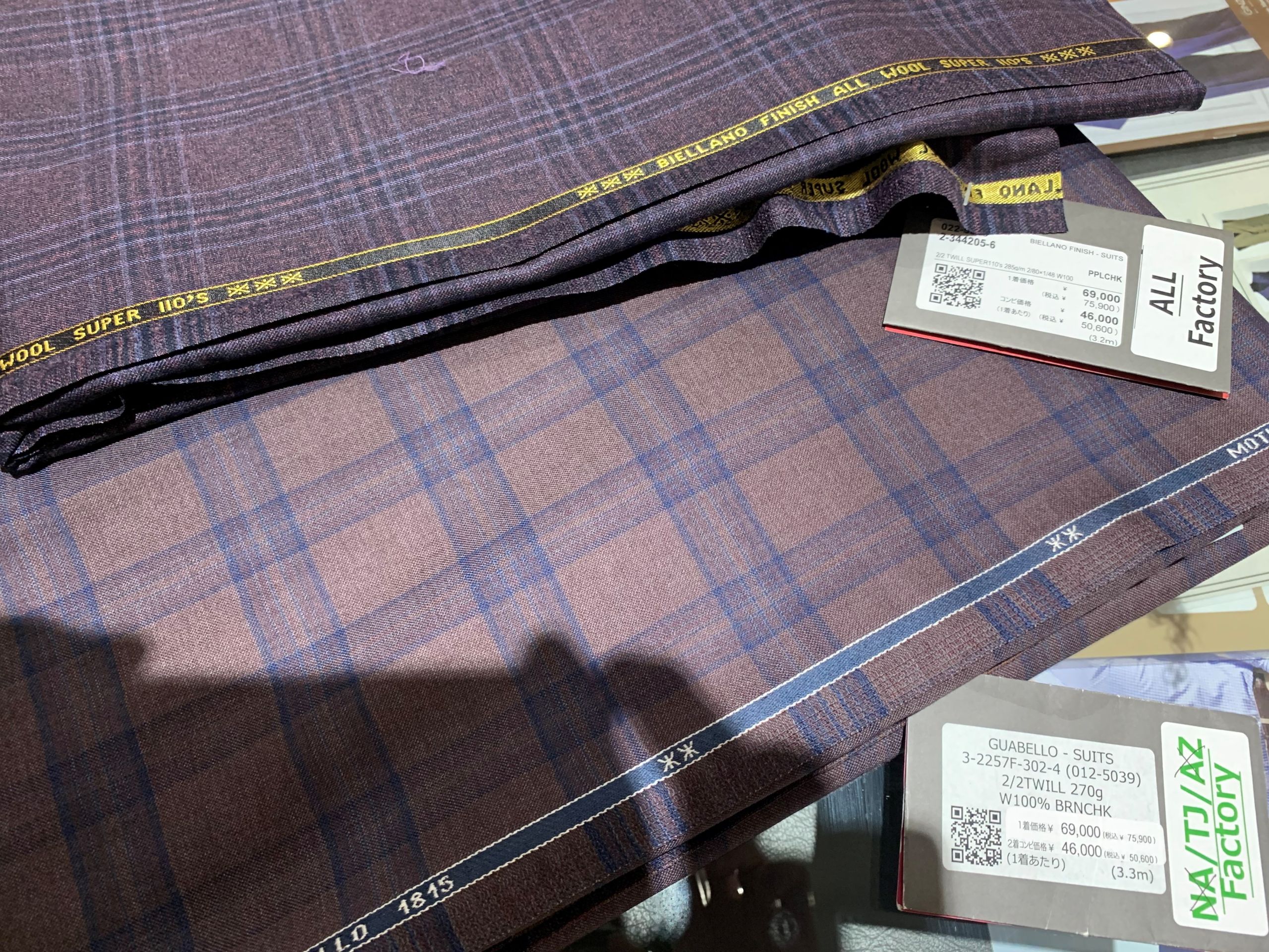 最近は成人式用のスーツをお作りされるお客様もちらほらいらっしゃいますので、少し奇抜な色の生地をご覧いただきます:)