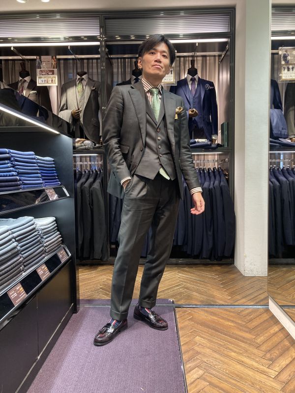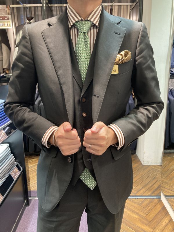 まず、こちらの色合いがチャコールグレーのスリーピーススーツになります。