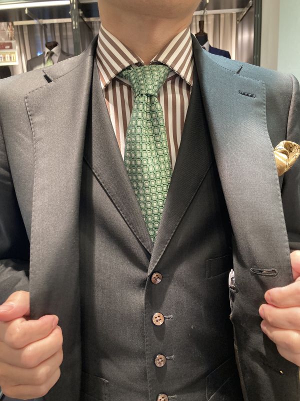 ネクタイ・チーフ・靴下等小物で存在感や華やかさが出るようなコーディネートを意識して着こなしてます。