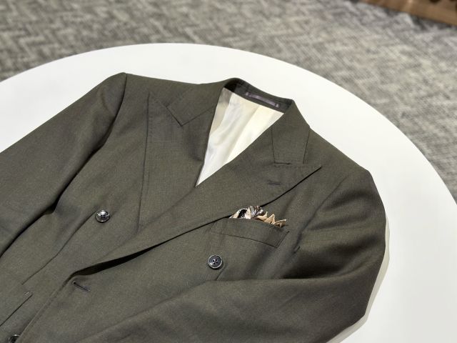 僕自身、入社して一番最初に仕立てたのがコチラのグリーンスーツ。