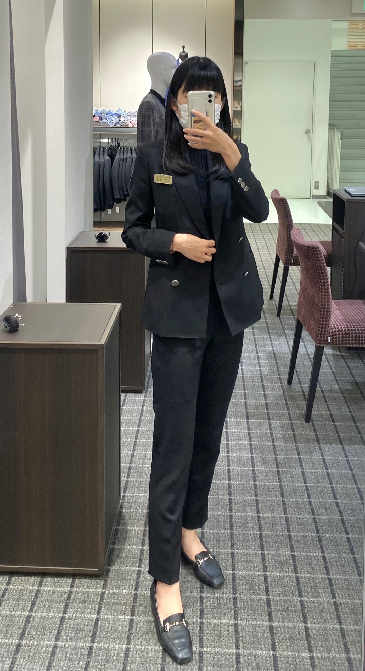私自身、髪の色が真っ黒なので、ブラックスーツを着ると重たい印象になるかと思いなかなか手を出せなかったのですが、デザインやボタン・シルエットにこだわる事で当初の印象を覆すことができたので、皆様もぜひ店頭にて生地やデザインをご覧くださいませ