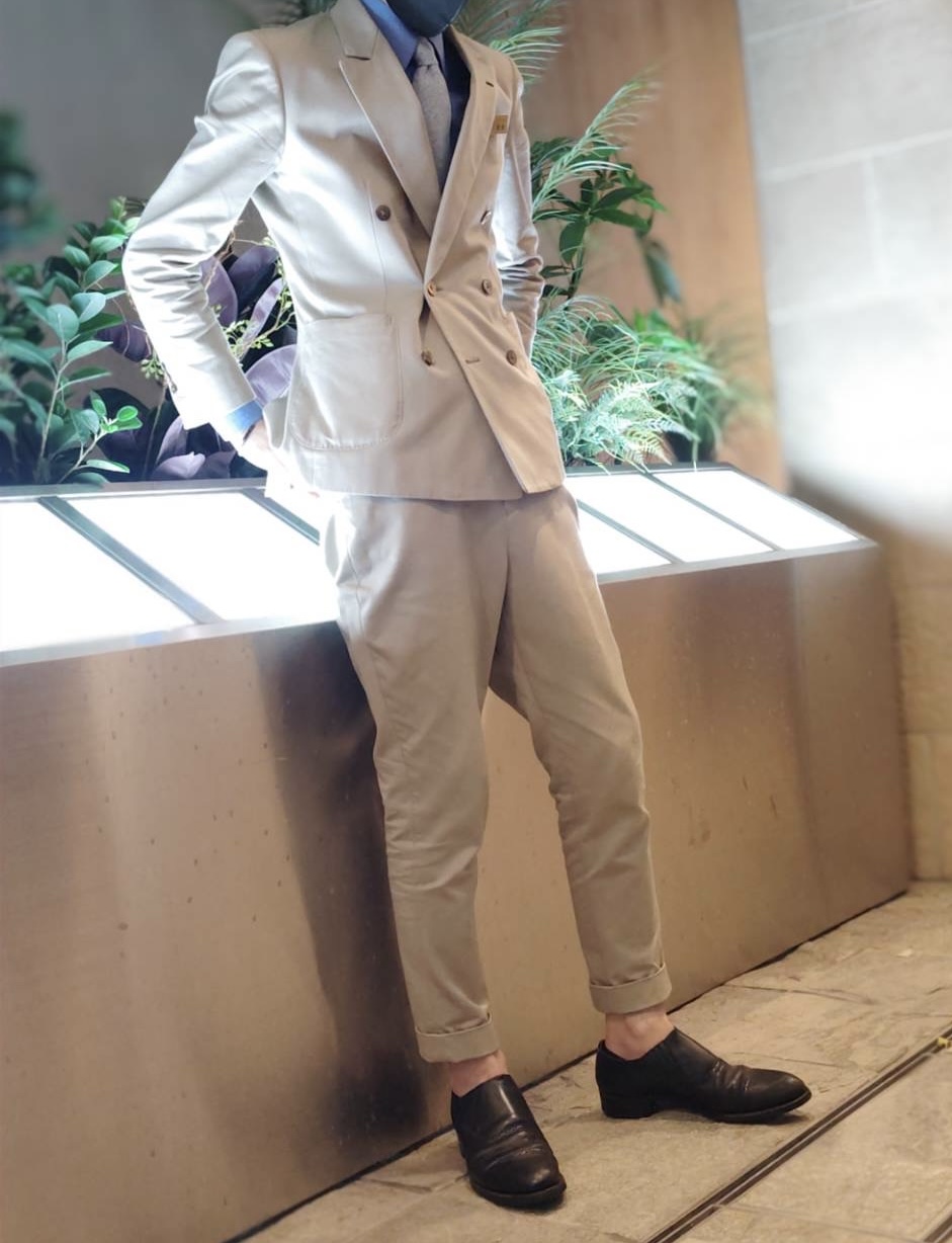 ビジネススーツにはなかなか無いカラーで、ウールとはまた違った質感です。