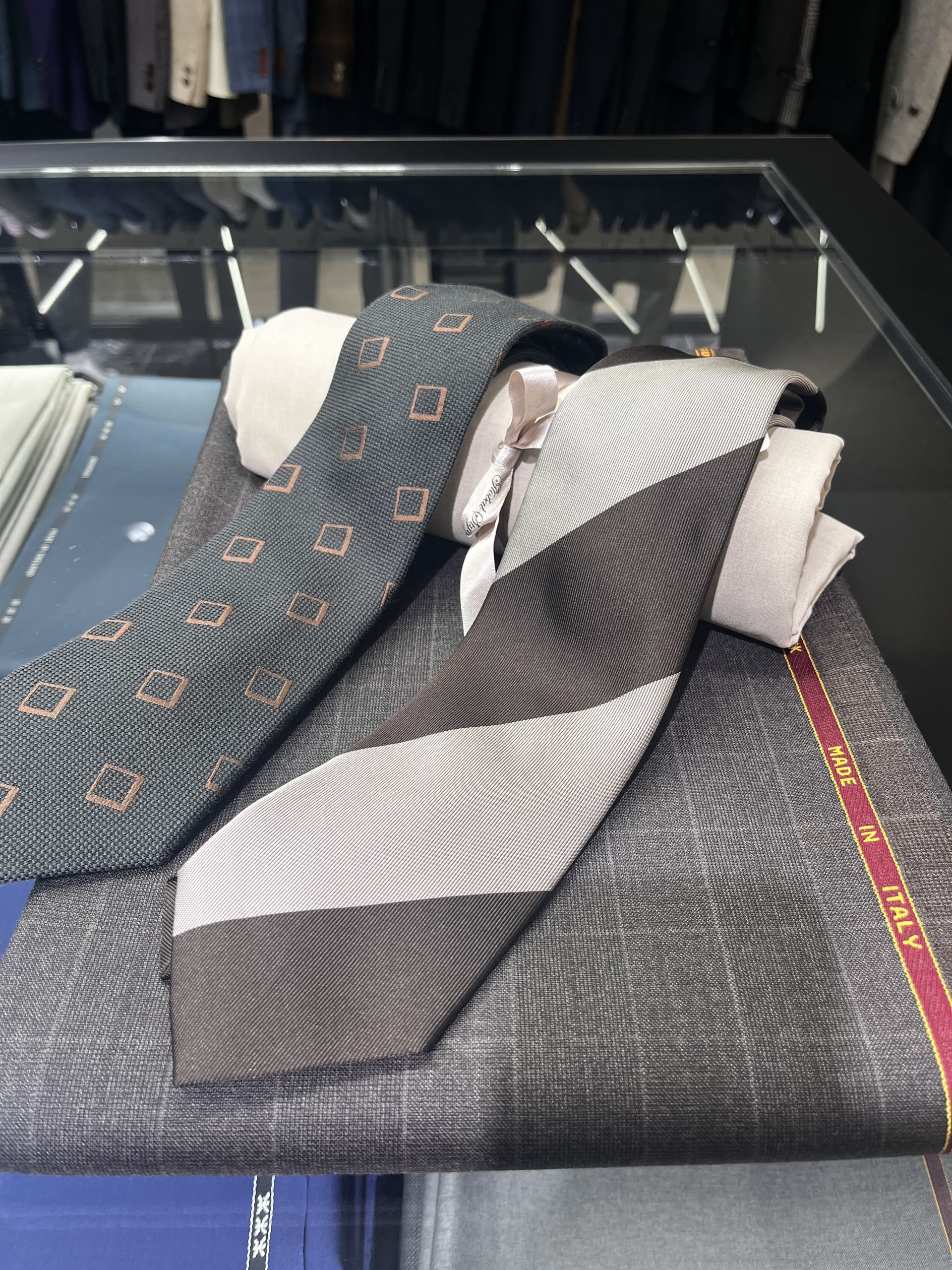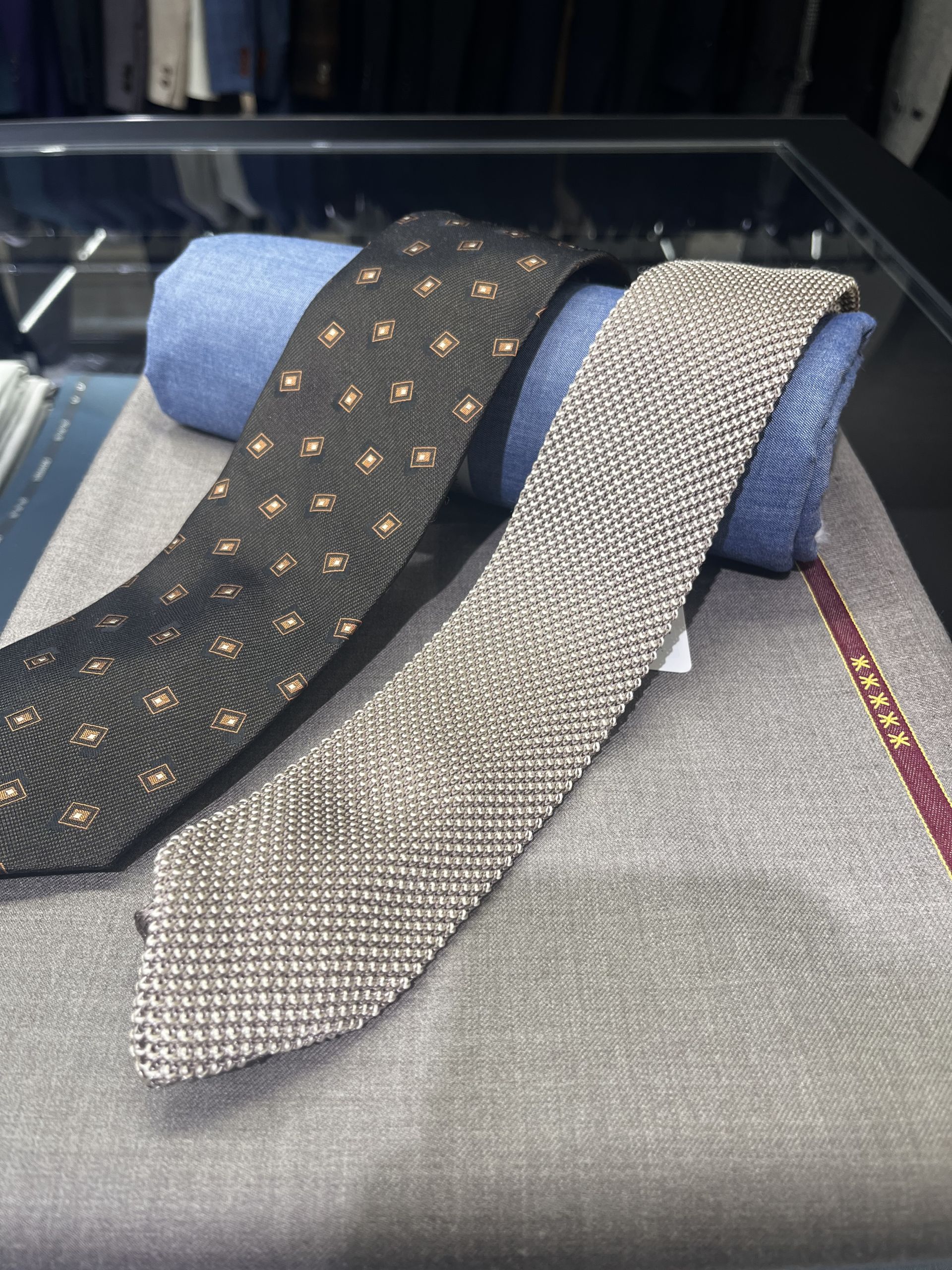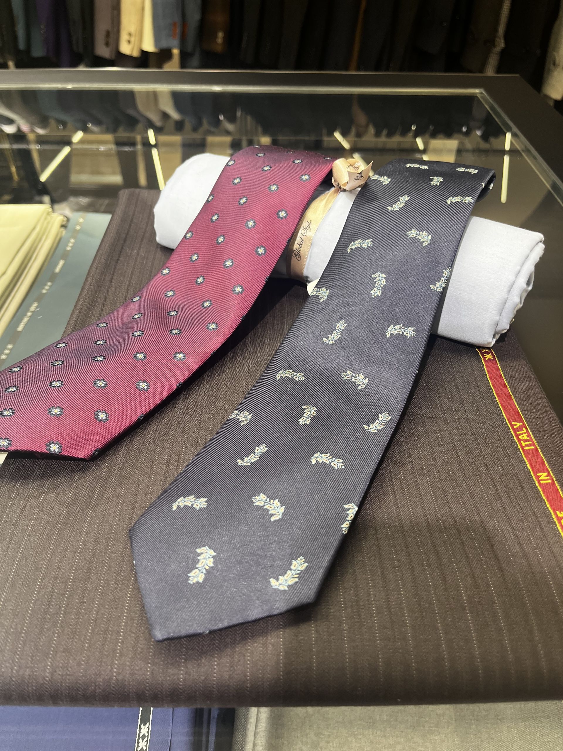 また、右側のタイでは花のモチーフの入ったタイを選択しています。こういった自然の色味に近い色柄のスーツを着用するときは小物も自然モチーフのものにしたくなりますね。
