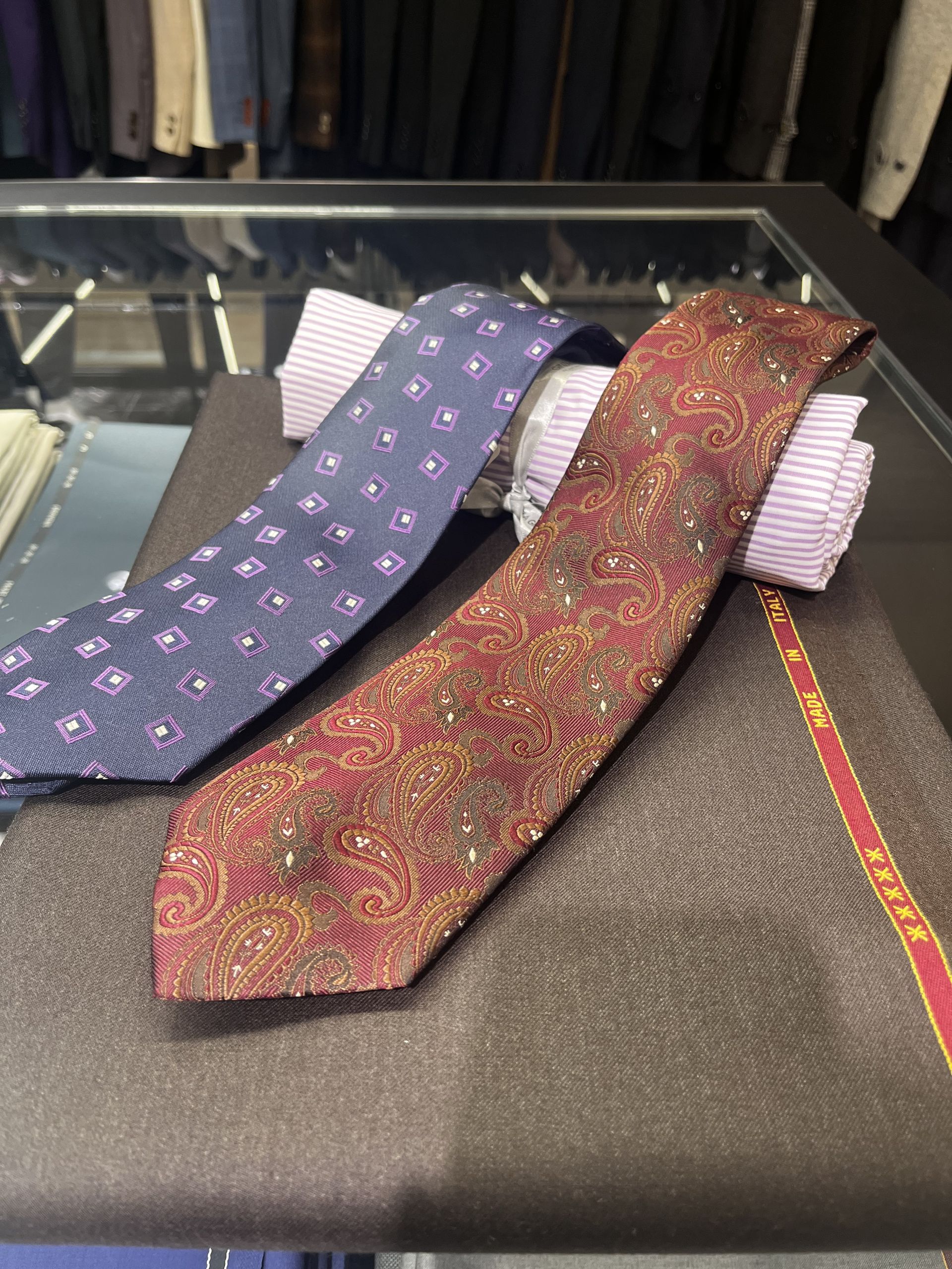 そして左側のタイでは、シャツの色味を拾ったネイビーベースにパープルの柄色を選択しています。