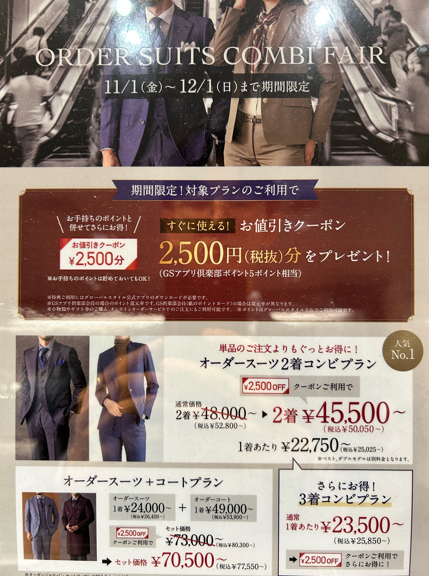 今ならスーツとの組み合わせでスーツもお得にご購入いただけて、更に ¥2,500 値引きクーポンもプレゼントしております。