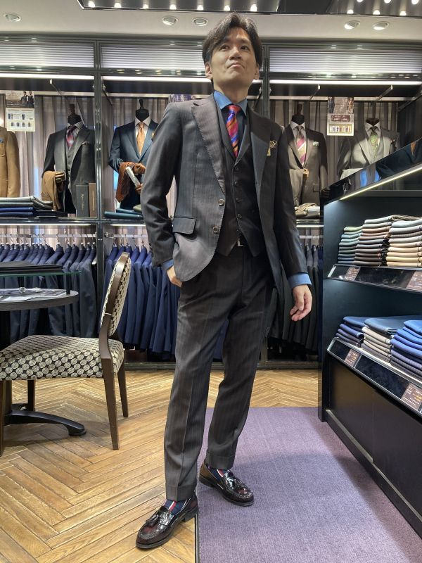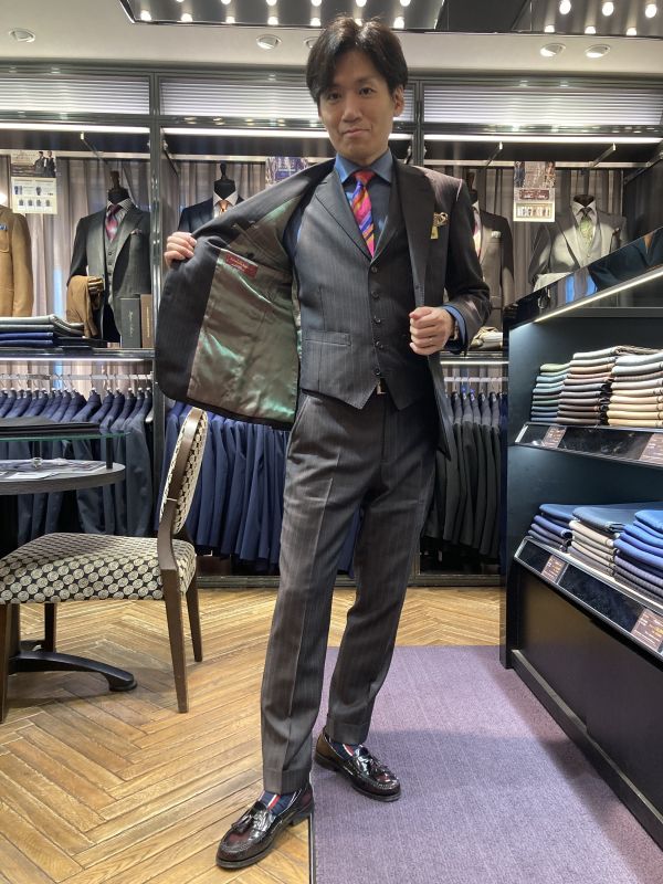 生地は目立ち過ぎないぐらいのストライプでプラス色合いも深いので、シャツはネイビー系で合わせたり、