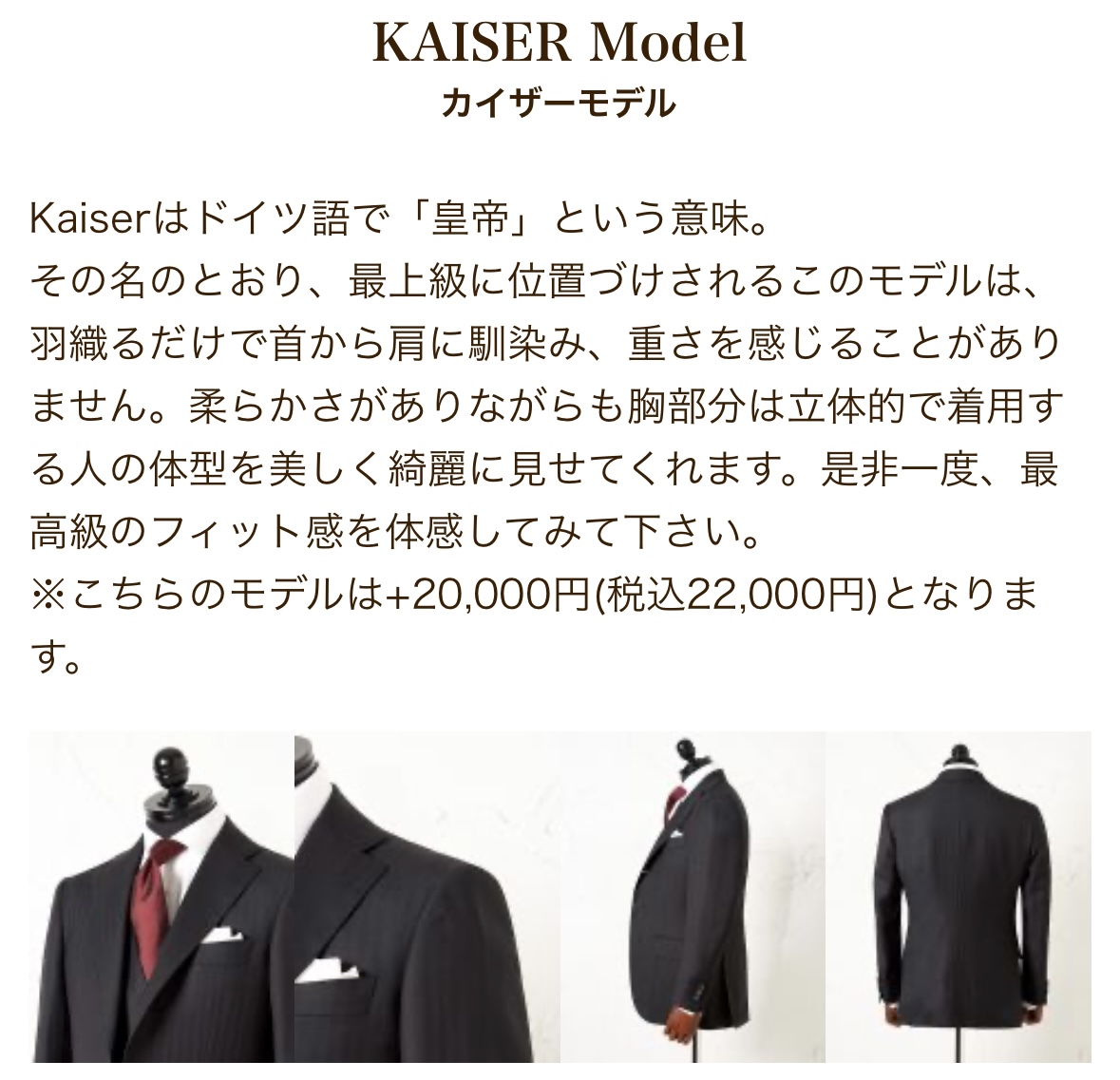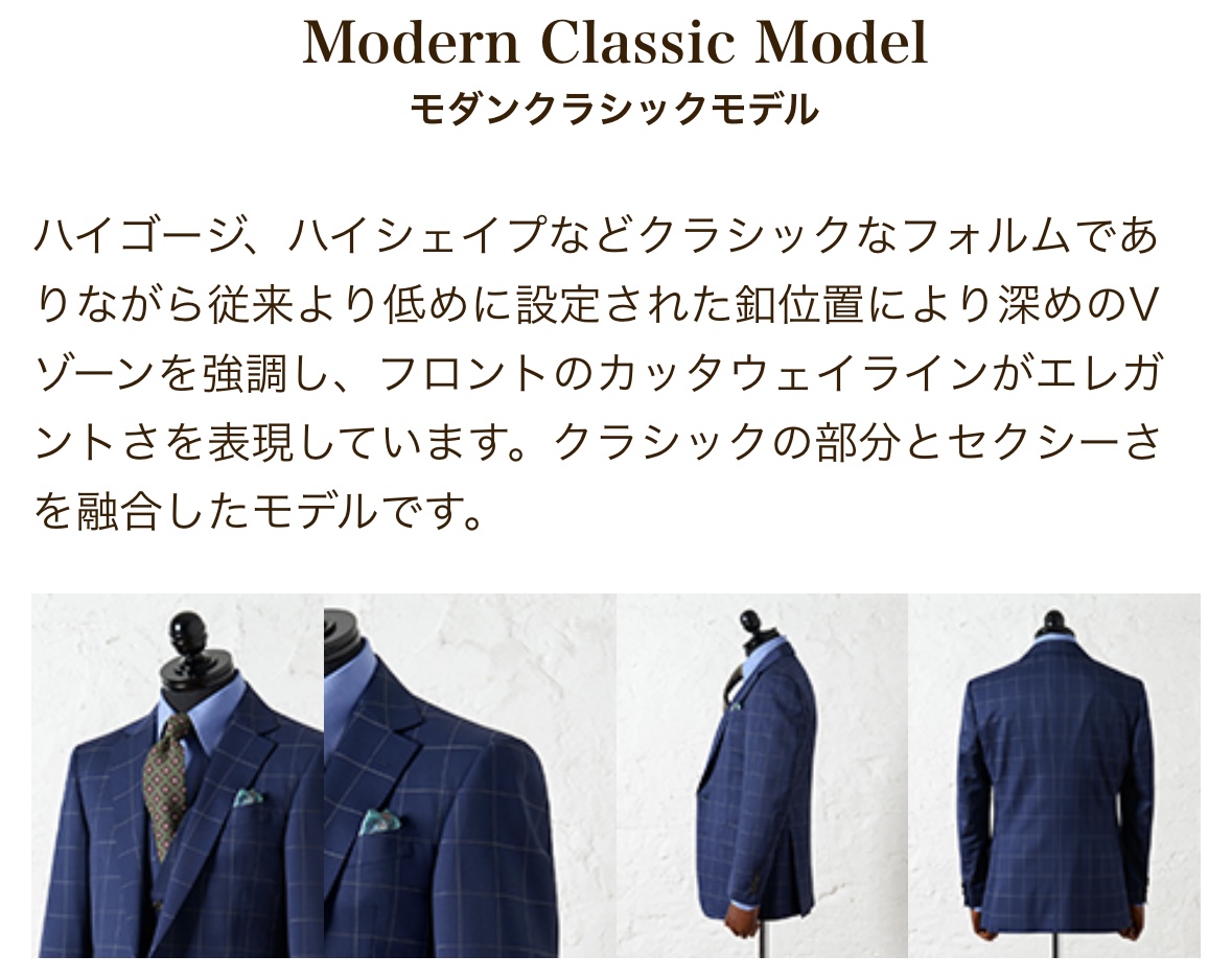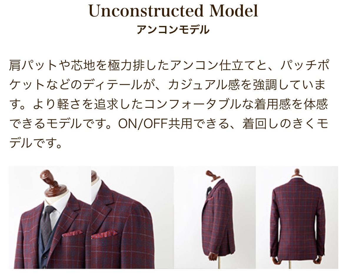 パターン(モデル)によって肩パットの入り具合・釦位置の高さ・着心地など、様々な違いを感じれます。