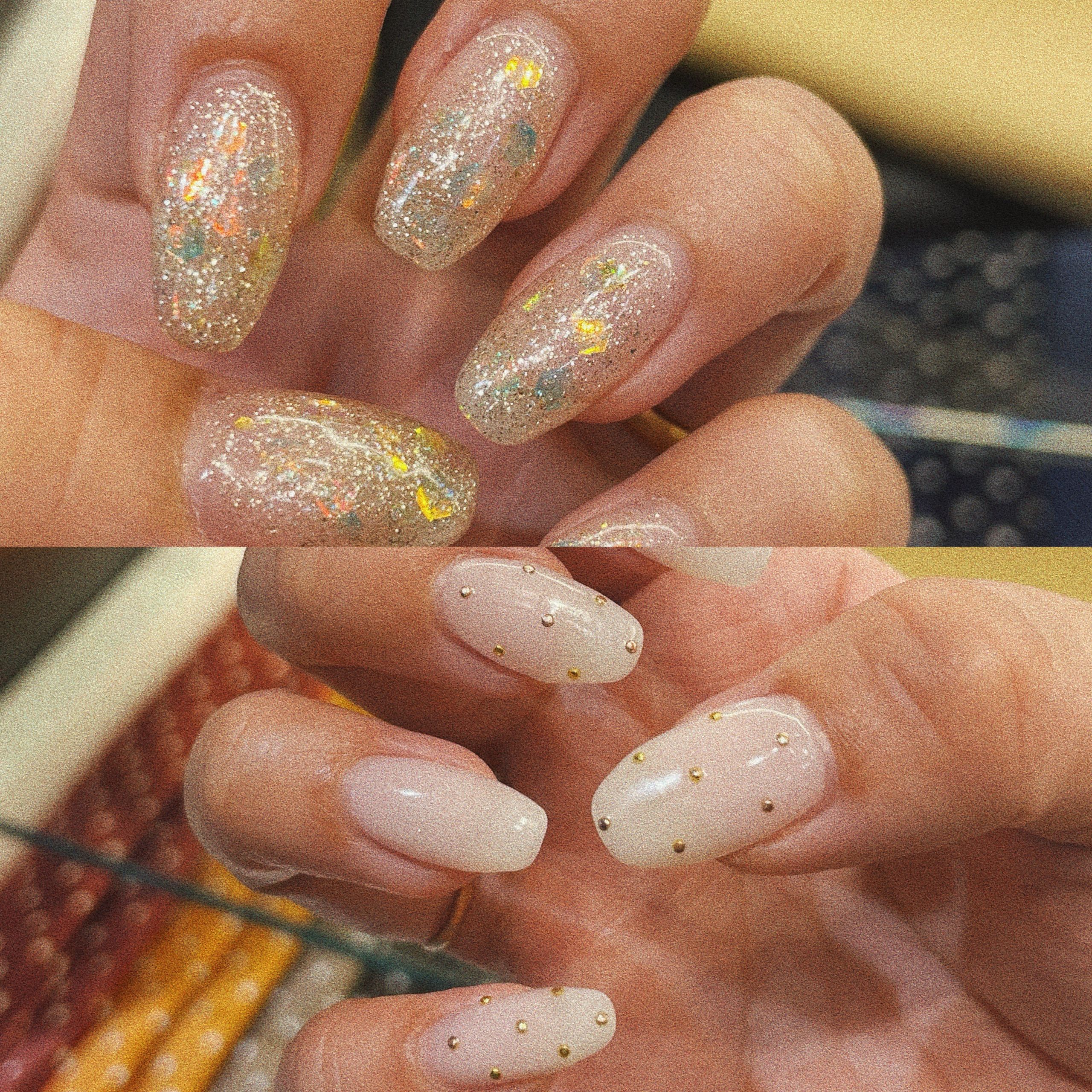 左手はラメラメのゴールド×右手はシアーホワイトの