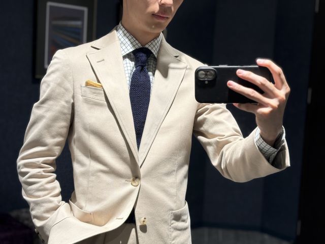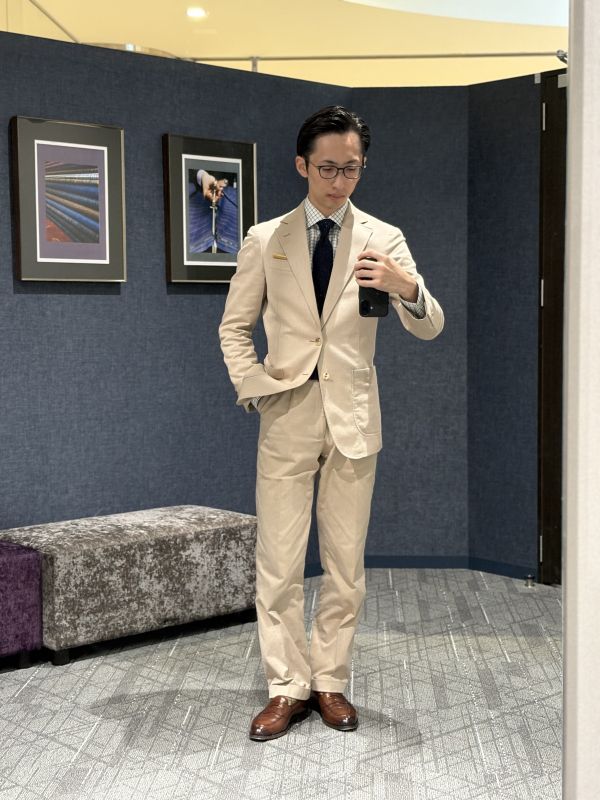 ベージュのコットンスーツになります!
