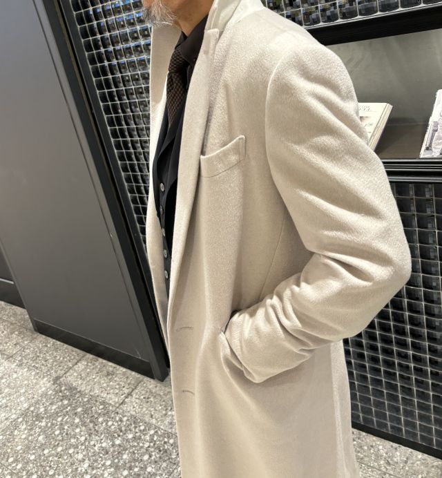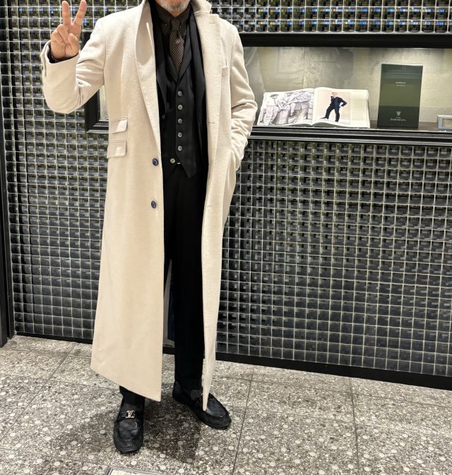 さて、本日は先月コートをお作りいただいたお客様がご来店されまして