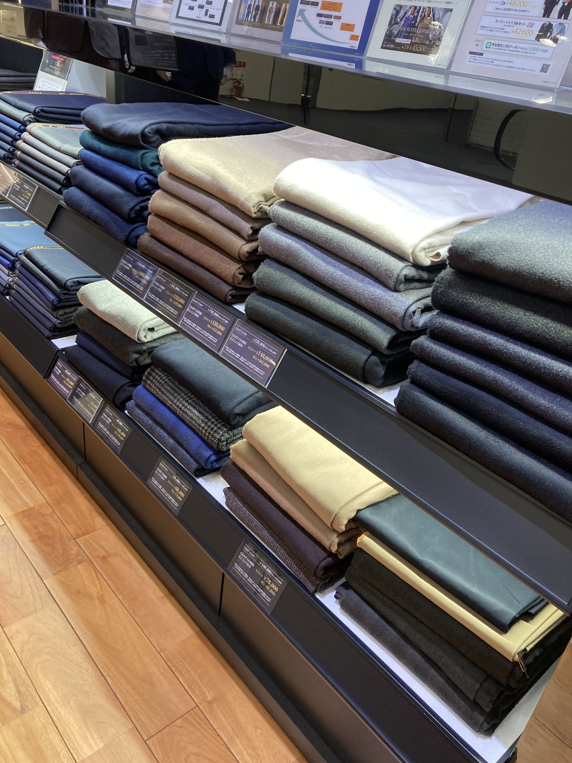 店頭入口からすぐコート生地が並んでおりますので、触って質感などすぐお試し頂けます♪
