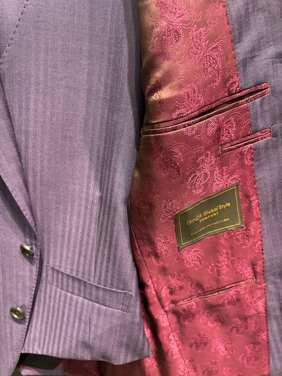 発色の良いパープル・大き目のチェック柄のグレースーツ・・・