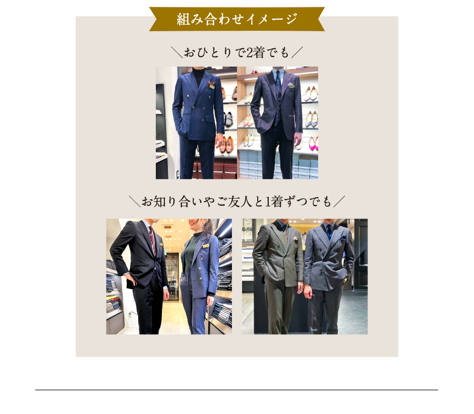 一人で2着お仕立てするもよし、友達や同僚と合わせて仕立てるもよし。