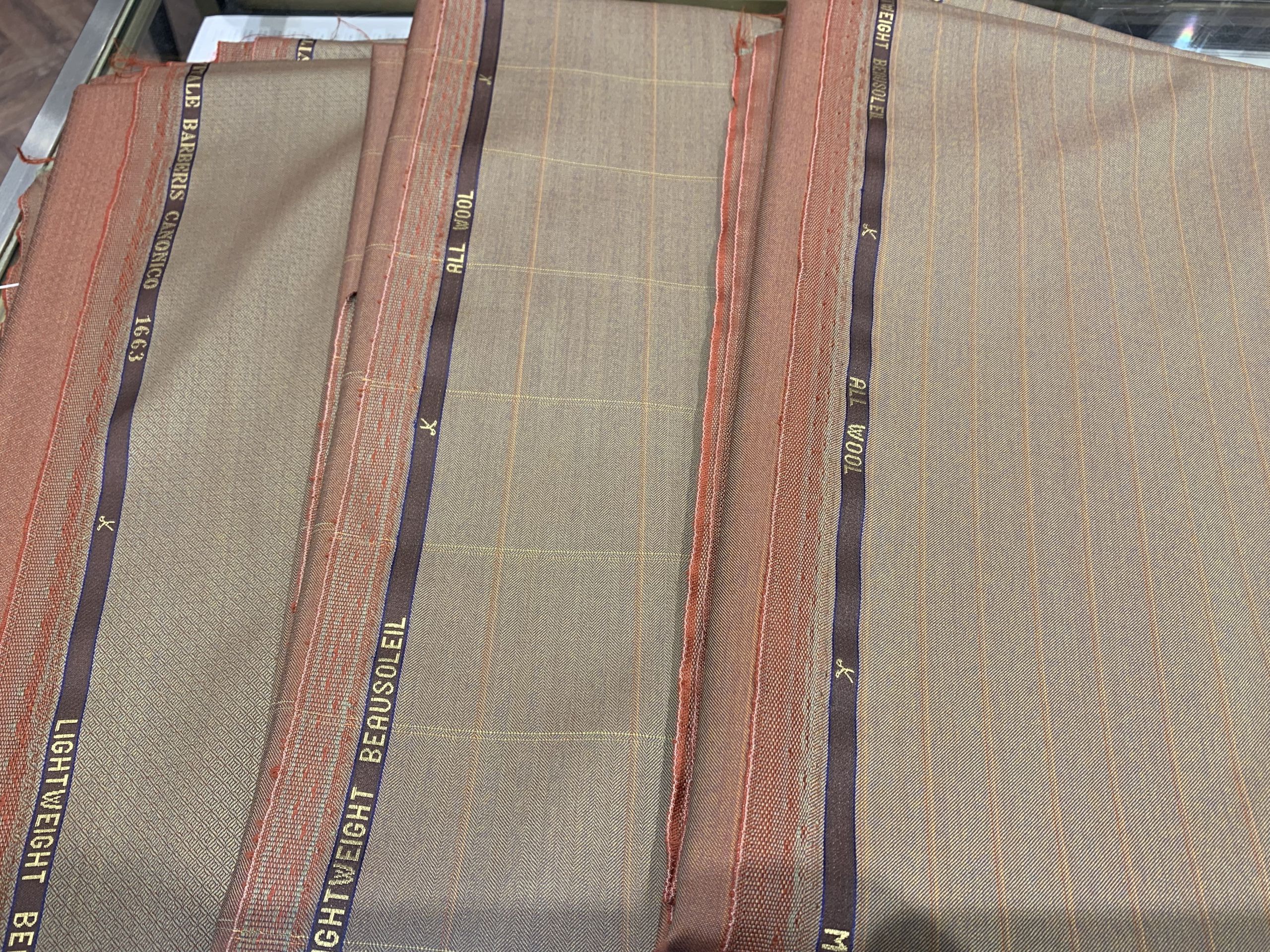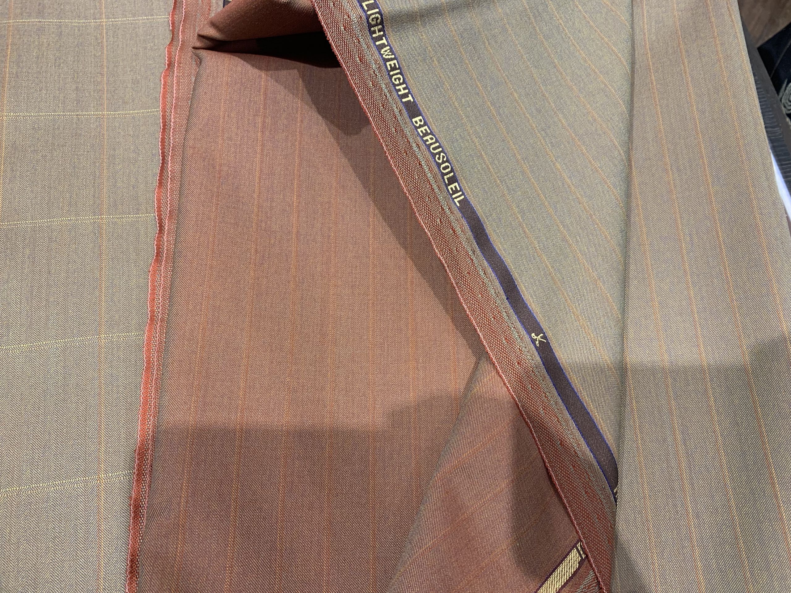 一見ベージュに見えるこの生地ですが、どこかオレンジのようなグリーンのような色が見えるのが特徴的です。