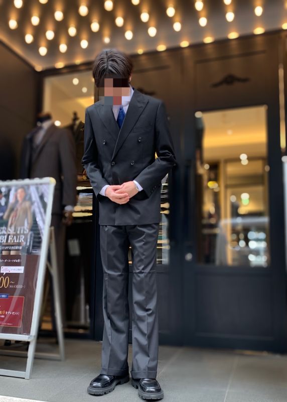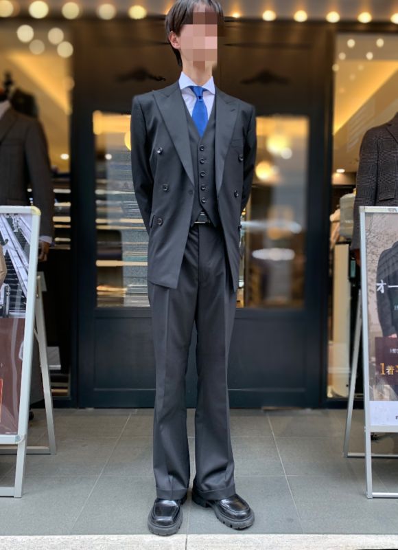 ダブルブレストのスーツを3つ揃えでお仕立て、スラックスのシルエットは裾に向かって広がるようなフレアパンツに。