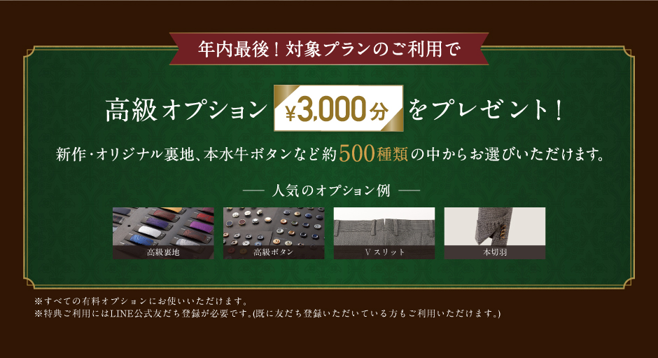 スーツを2着ご購入していただくと、高級オプションを3,000円分プレゼントです!
