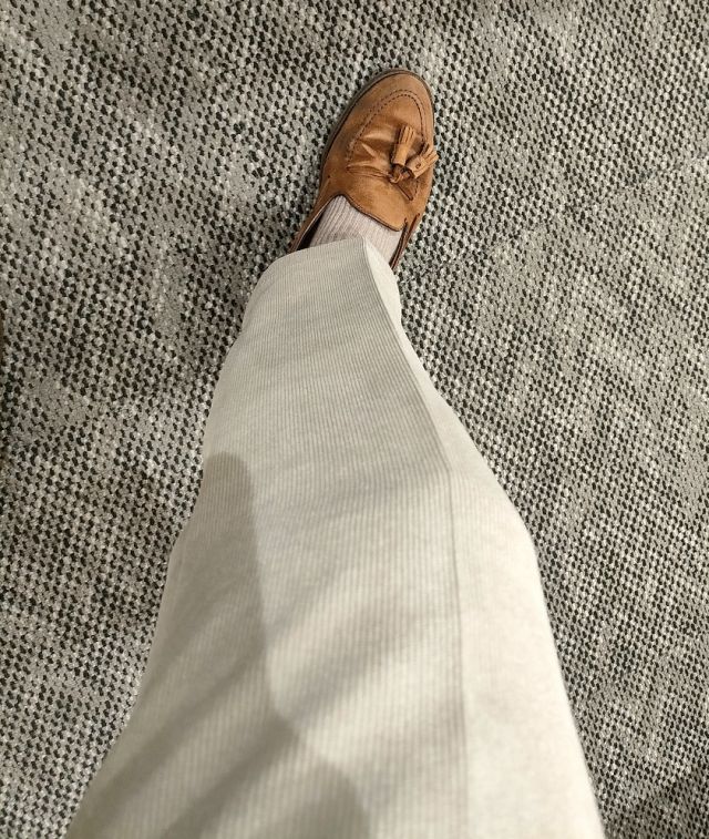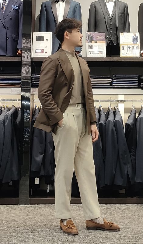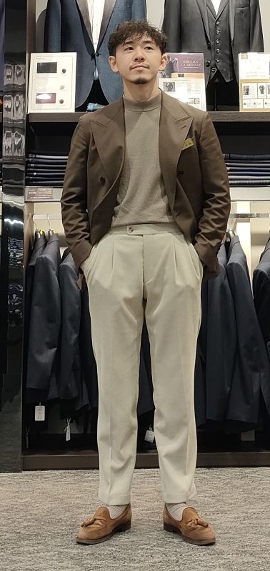 それに影響を受けまして、白~ベージュ~茶でジャケパンコーディネートを組んでみました。