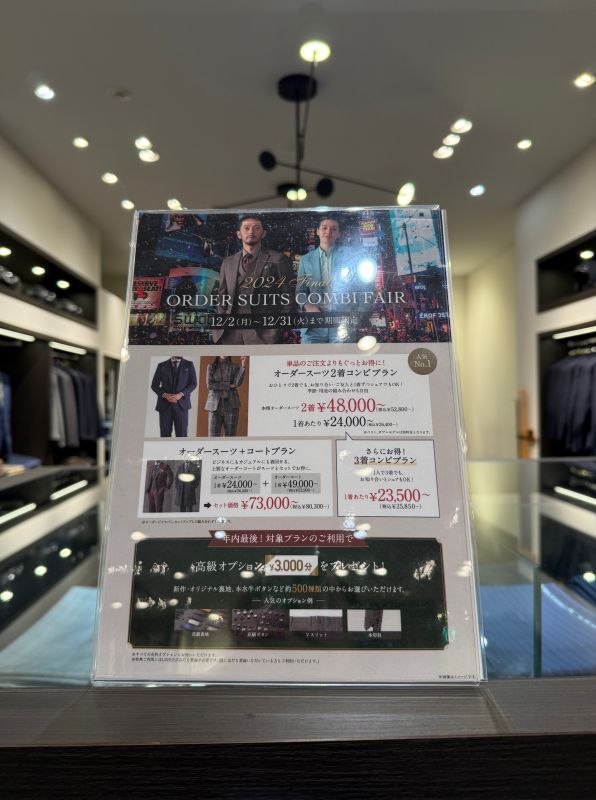 現在のフェアとしてスーツ2着で購入していただくと最安値帯では2着で税込み¥52,800からお仕立てもできます。