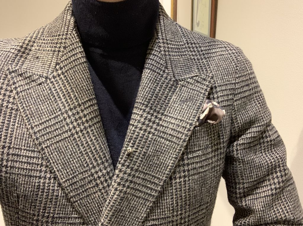 一般的なスーツ地と違い、紡毛と言って糸を揃えず不均一な状態で織るので生地感に膨らみが生じ、厚みのある生地感と保温性も格段と上がるのが特徴です。