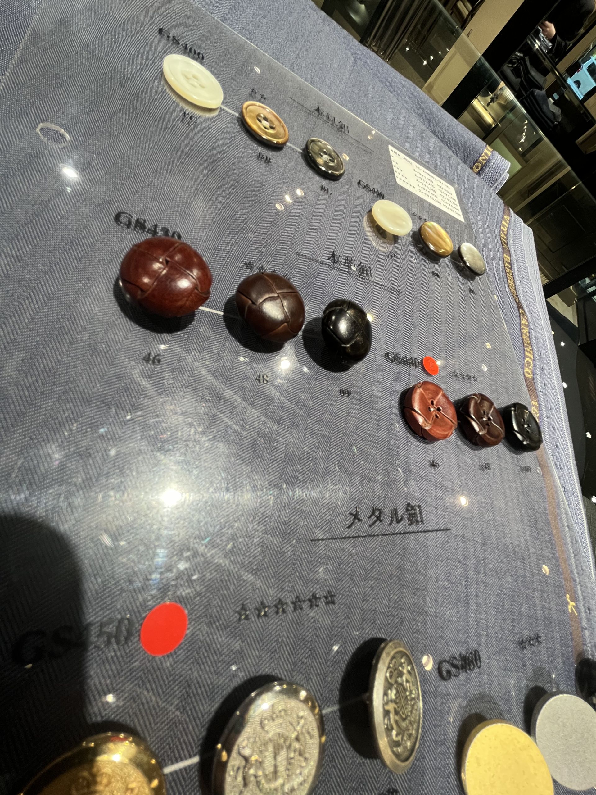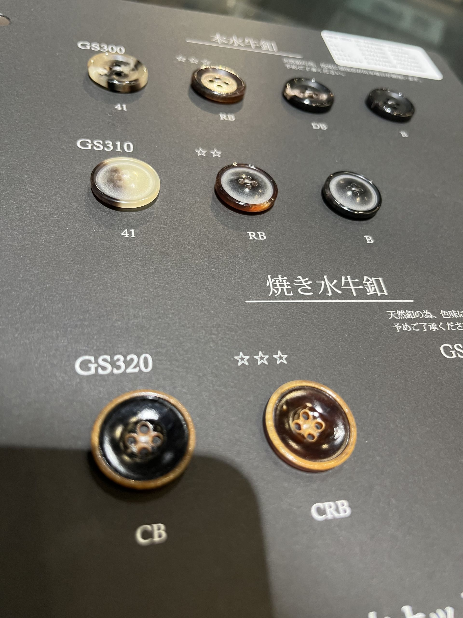 そのほかにも貝釦やナット釦、メタル釦などそろっておりますので、オーダーされる際は表地との相性なども考えながら楽しんでお選びいただければなと思います。