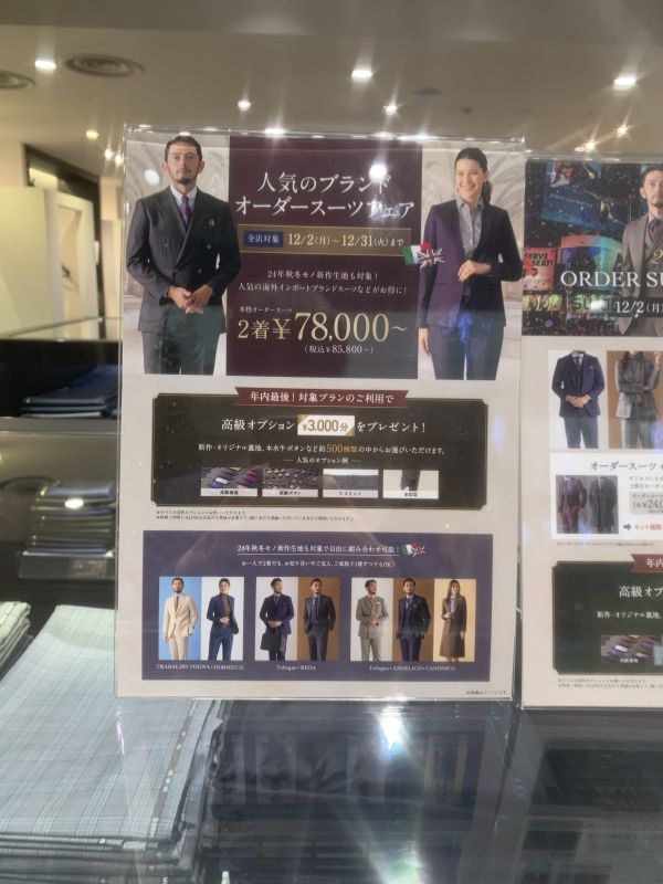 今ですと、2着で¥85,800(税込)~ 人気のブランド生地で仕立てられるフェアも開催しております!