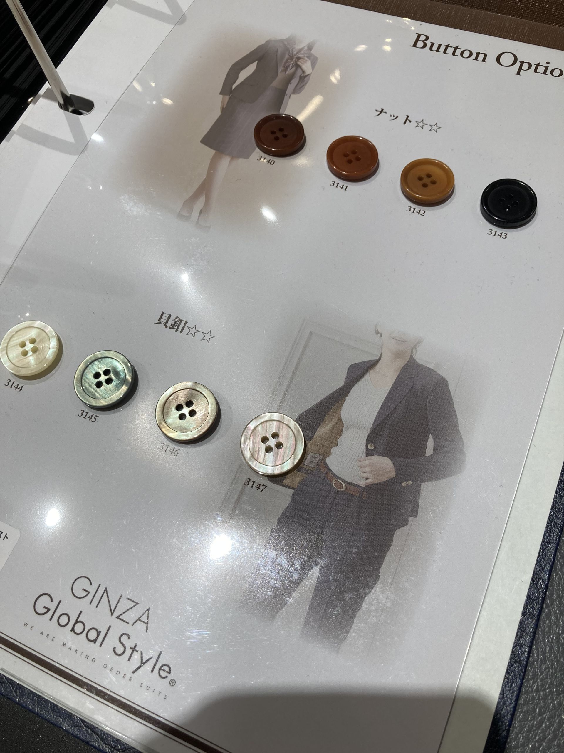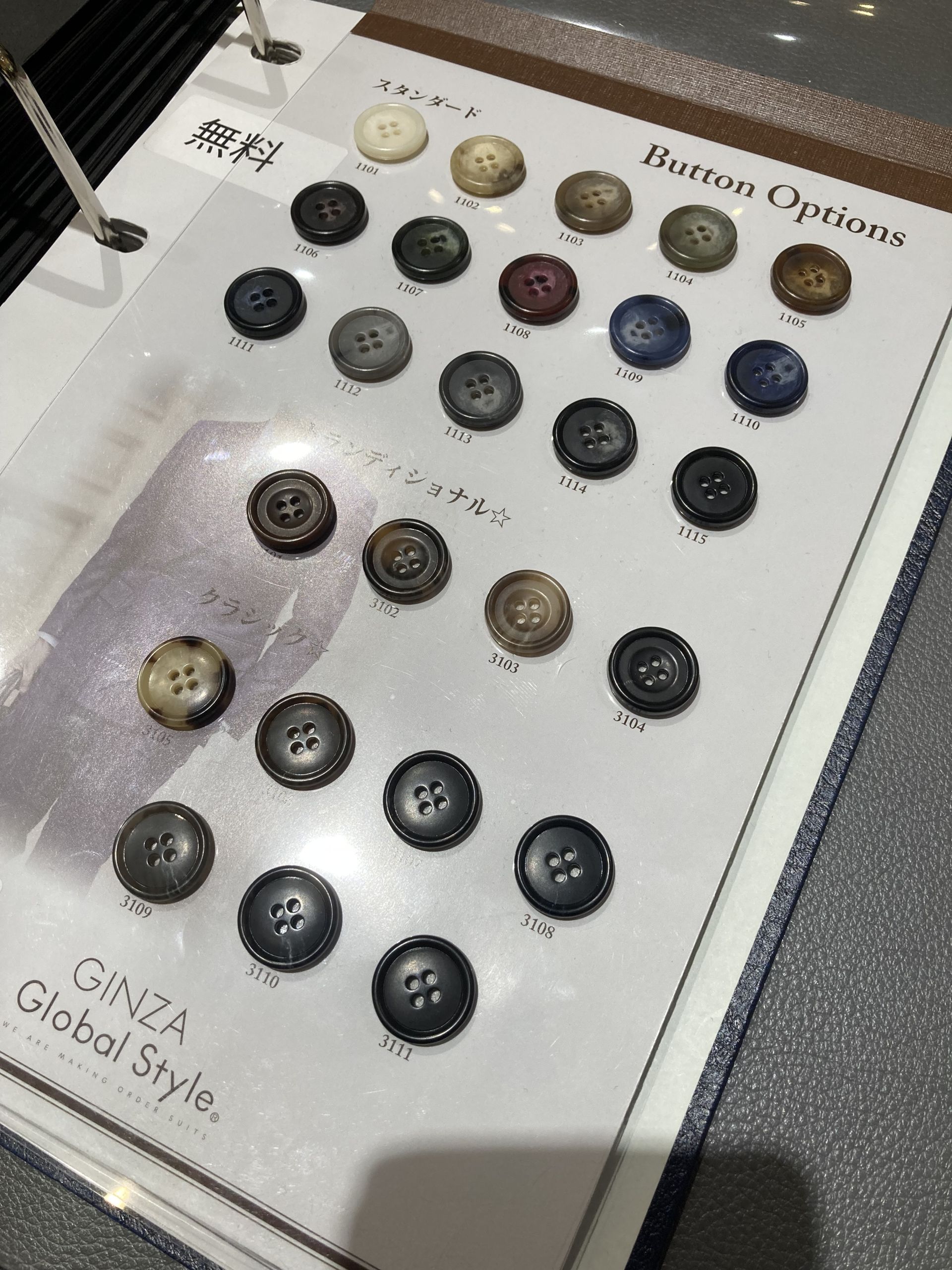 当店では釦選びの際、無料と有料の釦2パターンをご用意しております♪