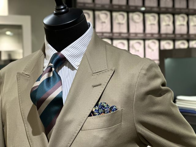 ネクタイの濃いグリーンとボディのライトグリーンで滑らかなコントラストを作り、程よく引き締めております。