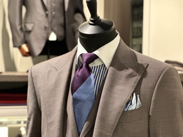 ライトブラウンは、細かいハウンドトゥースに3Pでクラシカルな印象。