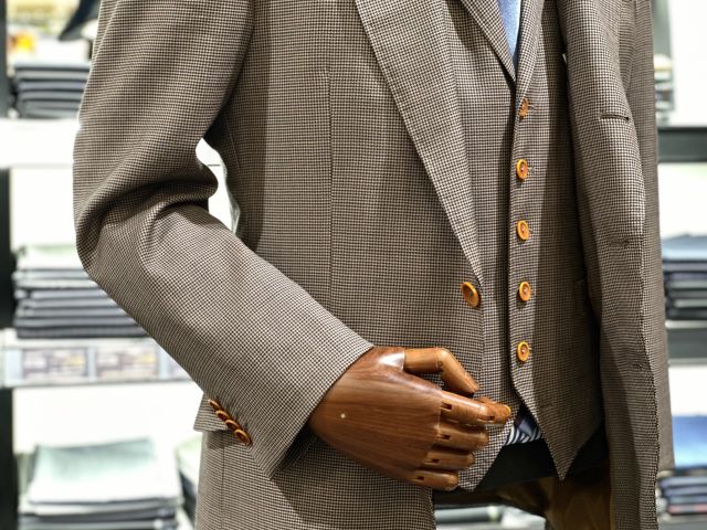 釦はスーツ・Vゾーンの配色を邪魔しないブラウンナット釦。