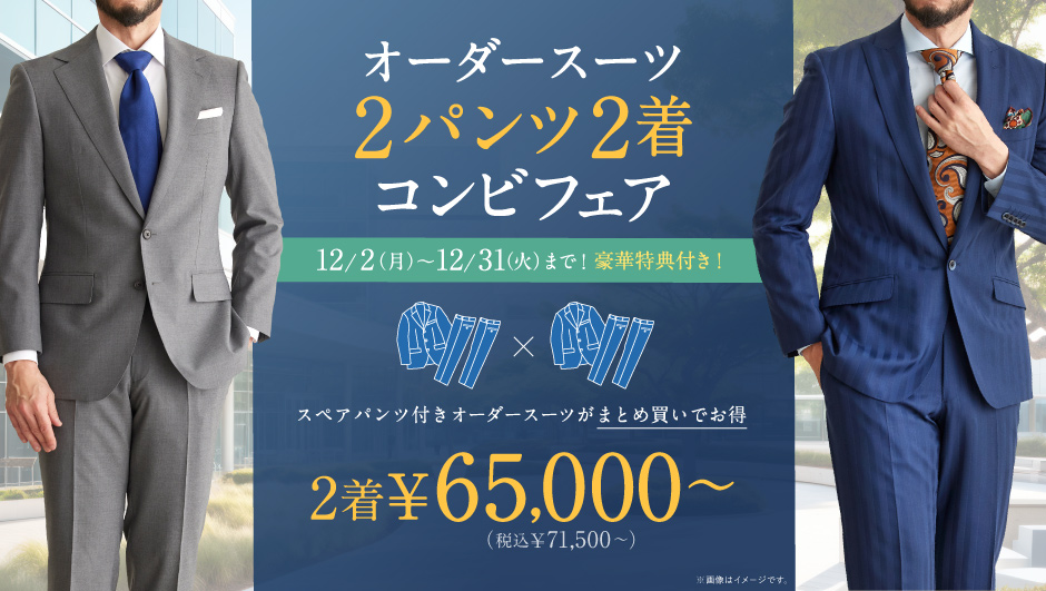 スーツ2着ともスペアパンツをつけても65,000円(税抜)からご案内できるというスーパーお得なフェア!!