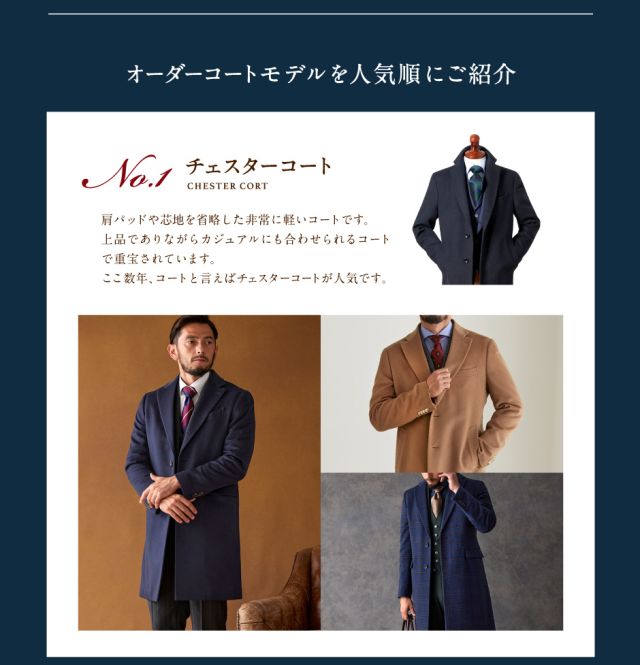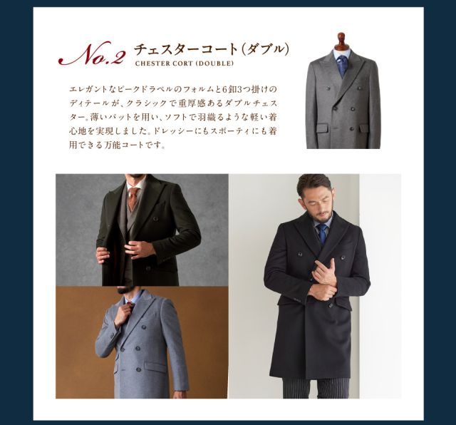 スーツの上に羽織るならチェスターコートは間違いないですね。