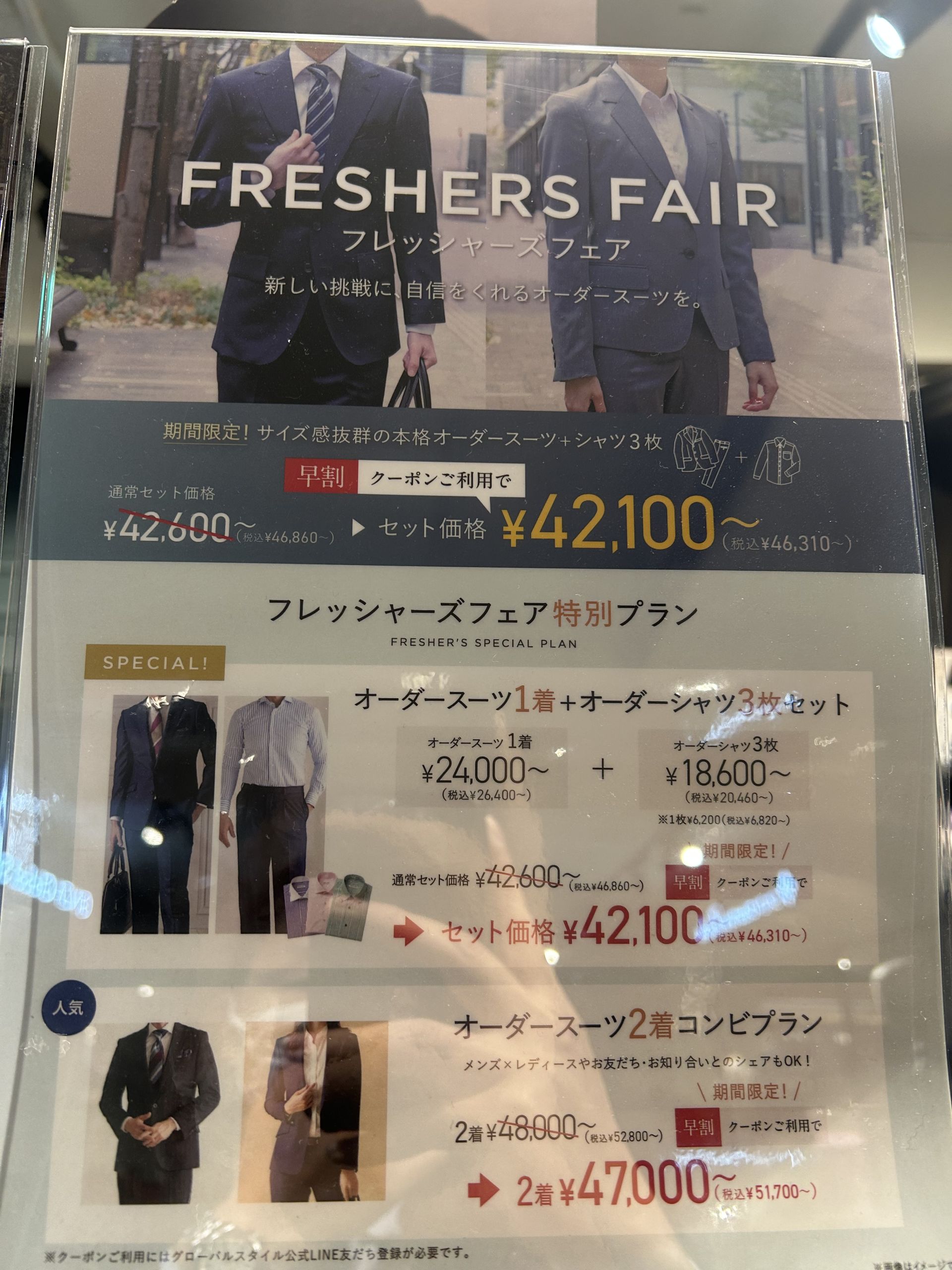 4月から新入社員の皆さまに向けて、オーダースーツは納期1ヶ月ほどかかります。是非対象の方にむけて新しフェアの登場です!