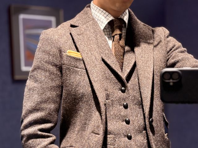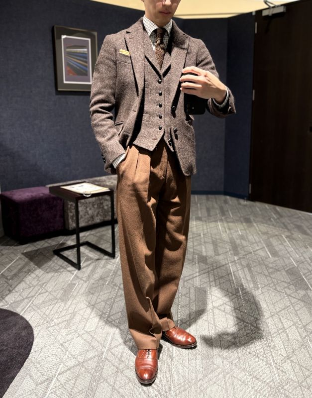 ジャケットとベストがハリスツイードで仕立てたもの。