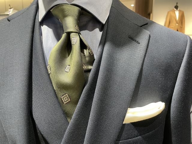 白のポケットチーフと緑のネクタイで爽やかな印象がUP!!!