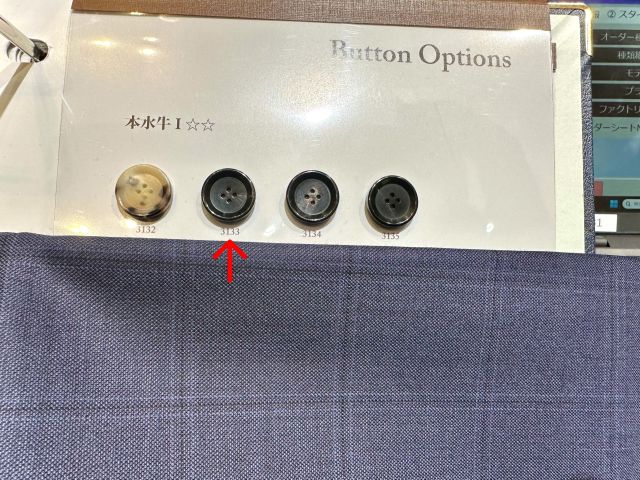 裏地はベーシックなシルバー無地。釦は本水牛のダークブラウンをチョイス。
