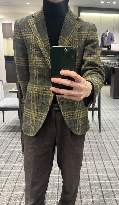 ちなみに私は本日グリーンチェックのジャケットと、ブラウンのパンツの組み合わせに、中はニットでカジュアルさをプラスしています。
