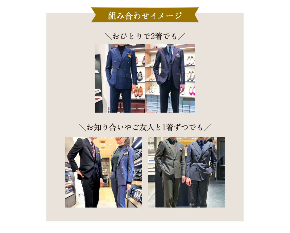 お一人で2着仕立てるもよし、友達や同僚と1着ずつ仕立てるもよしとまとめ買いがお得になっています!