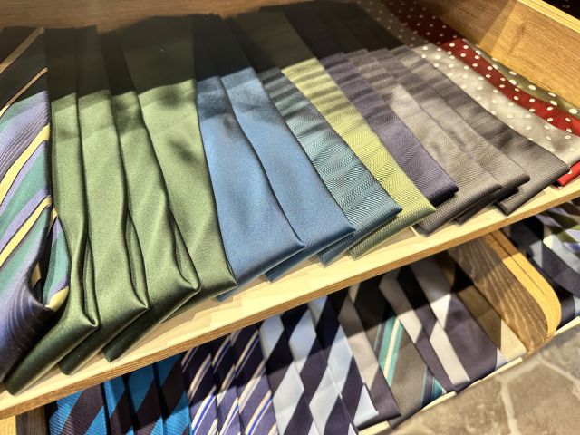 福岡天神店では現在、無地柄のニットタイを店頭にご準備しておりますので、ぜひご来店ください。