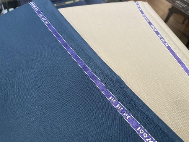 TRABEL WOOLのベージュとブルーグレーの生地です!