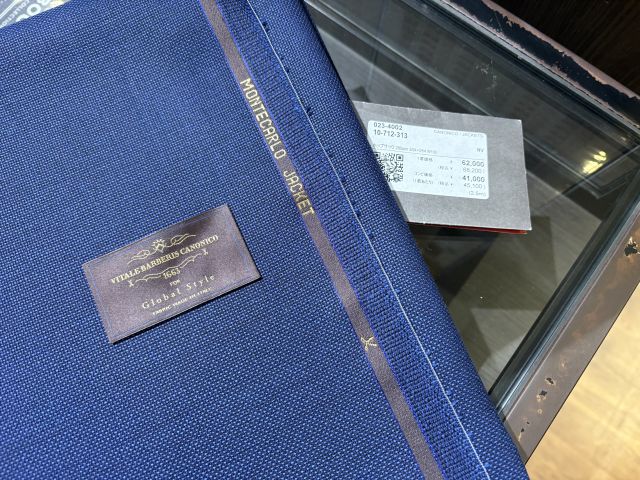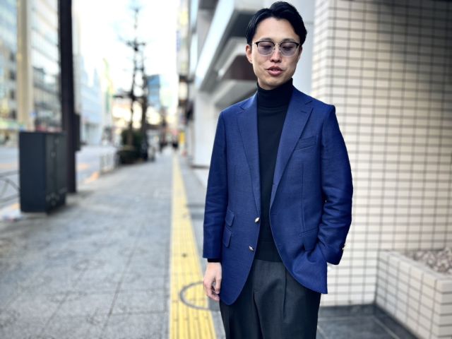 ジャケットはカノニコのブルー系ホップサックに金のメタル釦を合わせてみました。もう少し暗い色ならブレザーっぽくなりますね。