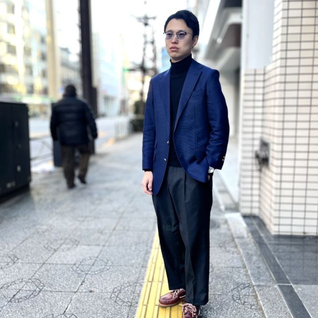 普段はシャツでネクタイを締めていますが、この日は薄手のタートルネックセーターを着用しています。サイズ感も相まってカジュアルダウンしたコーデになっています。