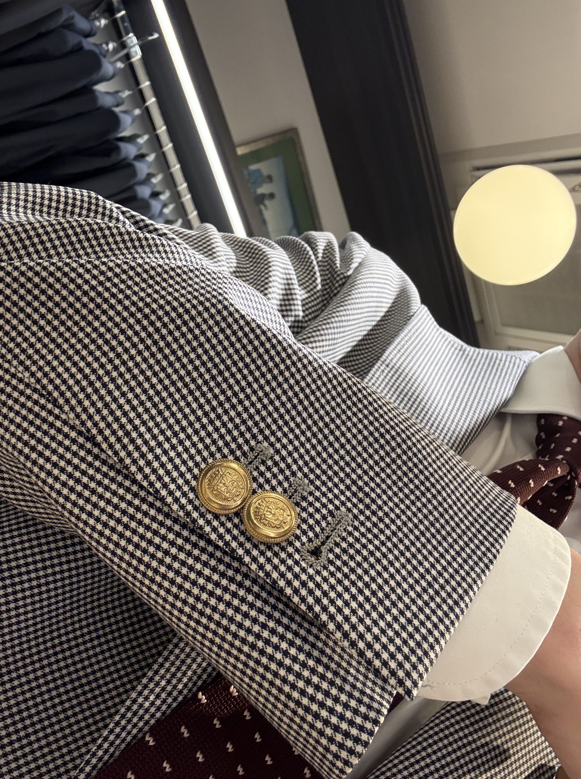 釦は金のメタルボタンで袖には本切羽というオプションを入れてます。スラックスはタック入りでゆったりさせていますが、脇尾錠とウエスト内側のゴム留めでベルトレスでもシャツが出ないようにしています。